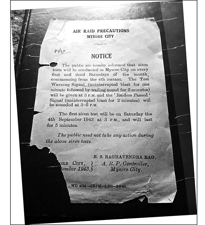 The notice stated: “The public are hereby informed that siren tests will be conducted in Mysore City on every first and third Saturdays of the month, commencing from the 4th instant. The Test Warning Signal (uninterrupted blast for one minute followed by a wailing sound for two minutes) will be given at 3 pm, and the ‘Raiders Passed’ Signal (uninterrupted blast for two minutes) will be sounded at 3.05 pm. The first siren test will be on Saturday, the 4th of September, 1943, at 3 pm and will last for 5 minutes. The public need not take any action during the above siren tests.”