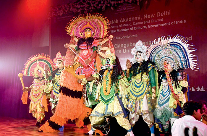 Mysuru: ‘Mahishasura Mardini’, Chhau dance ballet presented by a group of 15 artistes led by Parikshit Mahato enthralled the audience on inaugural day of five-day SNA Fellows and Awardees Festival of Music and Dance organised by Sangeet Natak Akademi (SNA), New Delhi, in association with Karnataka State Dr. Gangubai Hangal (KSGH) Music and Performing Arts University, Mysuru, on the occasion of World Dance Day at Vijnana Bhavan, Manasagangothri, yesterday.