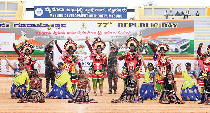 Chamarajanagar MP Sunil Bose, Chairman of Karnataka Exhibition Authority Ayub Khan, Regional Commissioner Nitesh Patil, Deputy Commissioner G. Lakshmikanth Reddy, ZP CEO S. Ukesh Kumar, City Police Commissioner Seema Latkar, MCC Commissioner Shaikh Tanveer Asif, Superintendent of Police (SP) Mallikarjun Baladandi, DCP (Crime and Traffic) K.S. Sundar Raj and others were present at the R-Day event.
