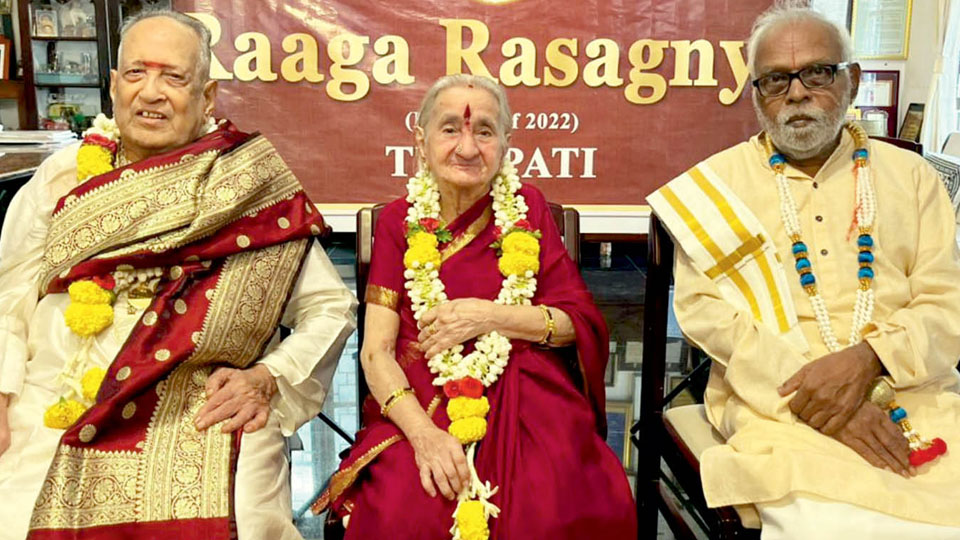 S.H. Venkatesh, President of Raaga Rasagnya, Hemavathy, Treasurer, Dr. K.V. Krishna, a senior violinist and HoD, SVCMD, Dr. K. Vandana, senior vocalist and faculty, SVCMD, Tirupati and several members of the Sabha participated in the felicitation, which brought everyone a feeling of divinity in a homely atmosphere.