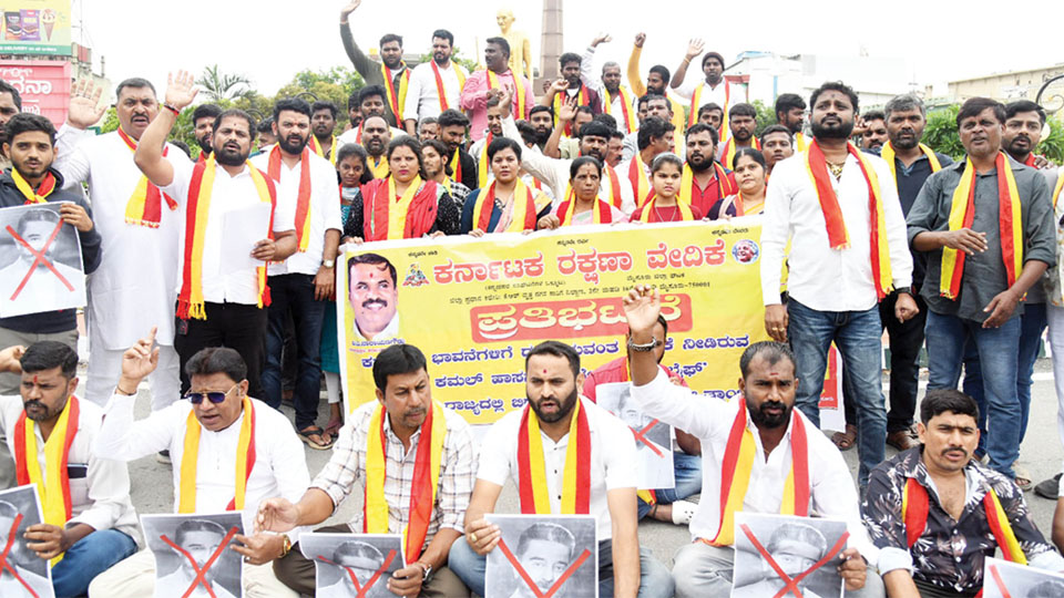 With Kamal Haasan refusing to apologise, the members of Karnataka Rakshana Vedike and Mysuru Kannada Vedike held separate protests in Mysuru yesterday demanding the ban of the actor’s upcoming movie ‘Thug Life’ in the State.