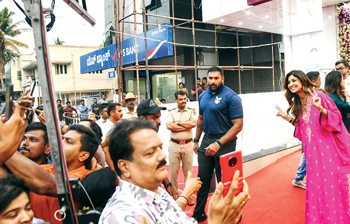 Mysuru: Popular Bollywood actress Shilpa Shetty Kundra inaugurated the second showroom of Kalyan Jewellers on Kalidasa Road in city yesterday. Shilpa Shetty, who waved at the enthusiastically gathered fans, cut the ribbon, formally opening the showroom of the reputed jewellery chain.