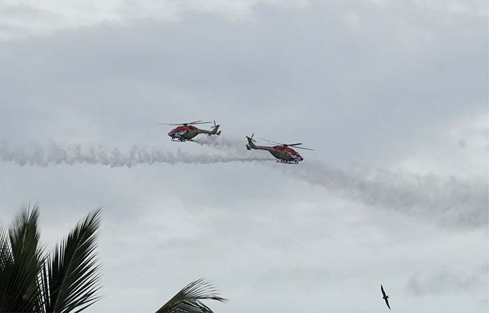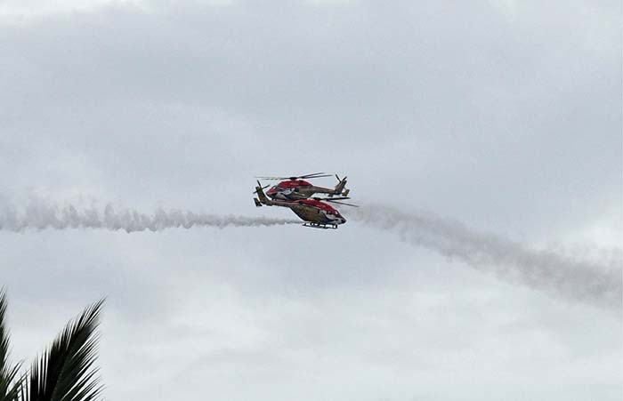 Mysuru: In a breathtaking prelude to the Dasara Air Show scheduled for Sept. 27, five helicopters from the Indian Air Force’s prestigious Sarang Helicopter Display Team stunned Mysuru residents with an impromptu aerial performance over the Bannimantap Torchlight Parade Grounds yesterday afternoon.