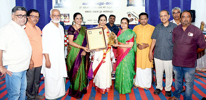 Picture shows Veena Vidushi Dr. Jayanthi Kumaresh, who has been selected for ‘Sangeetha Kalanidhi’ award by Madras Music Academy, Chennai, being felicitated by Sri Ramabhyudhaya Sabha Charitable Trust in Mysuru on Mar. 30. Seen are (standing from left) Trustee Srikantaswamy, Phanindra, Ramanujam, Vidu. Akkarai Subhalakshmi, Dr. Jayanthi Kumaresh, Mamatha Sriram, Janardhan (behind), Arjun Kumar, Dr. Sriram, Sridhar and Guruprasad.