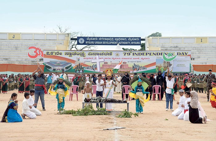 Mysore/Mysuru: The 79th Independence Day was celebrated with patriotic fervour, by the District Administration at Torchlight Parade Grounds, Bannimantap in city yesterday.