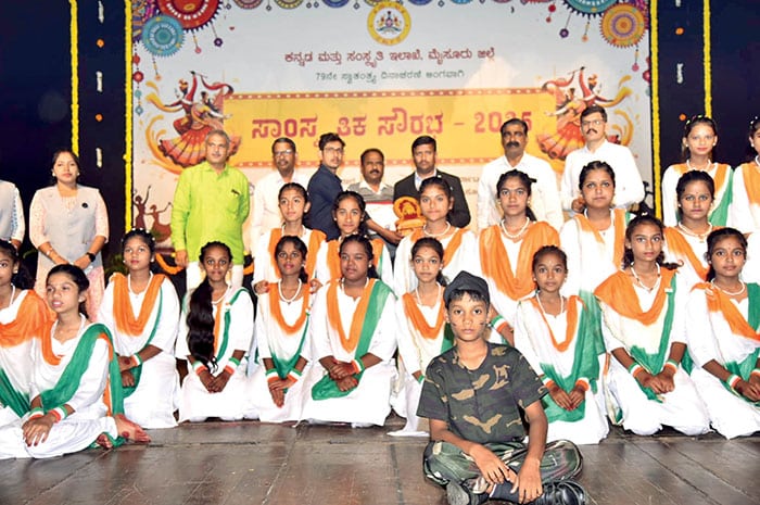 Students participating in the cultural programmes organised as part of 79th Independence Day celebrations, by Kannada and Culture Department, at Kalamandira in city yesterday.