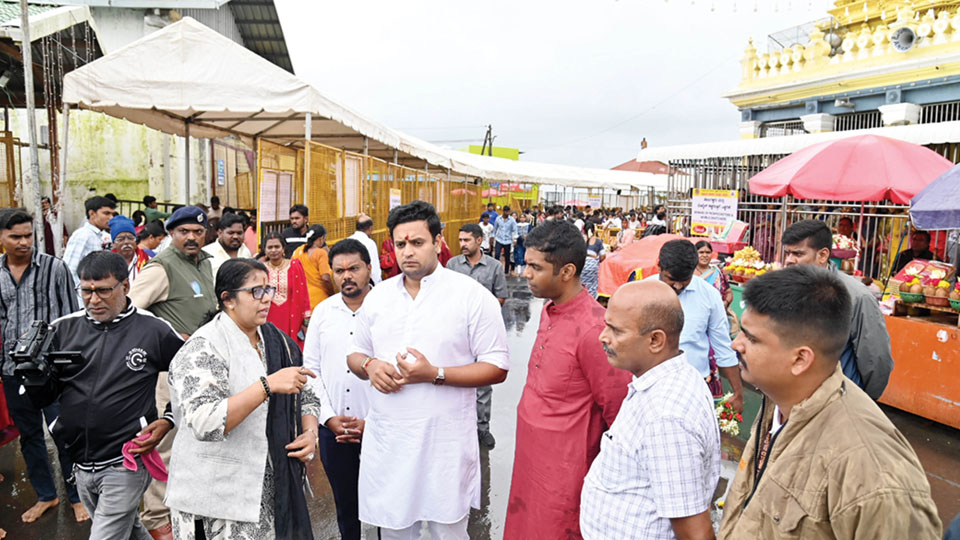 Mysore/Mysuru: Mysuru-Kodagu MP Yaduveer Krishnadatta Chamaraja Wadiyar inspected the arrangements made for Second Ashada Friday Puja (July 4) at Chamundi Hill in the city yesterday.