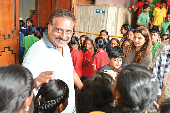 Multilingual actor Prakash Raj seen interacting with school children at Kalamandira yesterday as his wife Pony Verma and son Vedhanth look on. Later, Prakash Raj, along with his family, watched the Kannada play ‘Roopantara’ staged by students of Kaliyuva Mane, Mysuru, as part of Children’s Bahuroopi. The play was designed and directed by Rajesh Madhavan.
