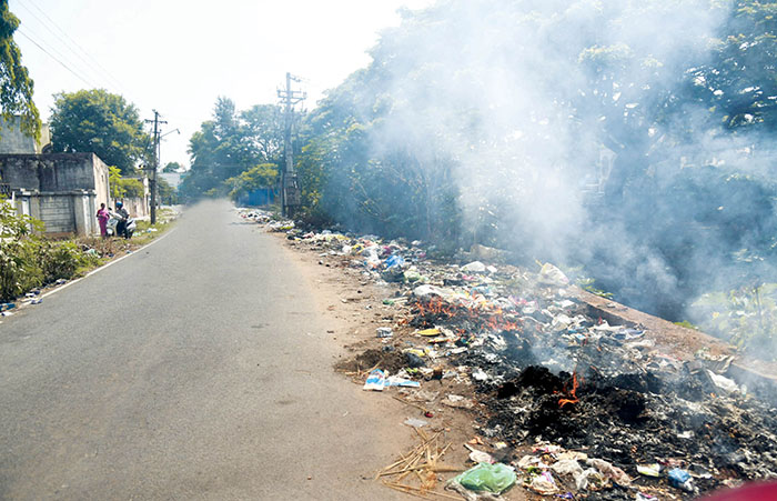 Wastes such as household garbage, plastics, paper, beds, pillows, thermocol packing, empty cardboard boxes, packing materials and other such items, which are dumped along the big drain connecting Bannimantap and Hanumanthanagar, adjacent to Bhuvaneshwari Kalyana Mantap, are being ignited by unknown persons resulting in toxic smoke engulfing the surroundings. Though MCC has put up a board warning public against dumping garbage and hand over the same to Pourakarmikas who come to the doorstep every morning, garbage is still being dumped and set on fire. Also, electric wires are being burnt in this spot to collect copper which is resulting in toxic fumes and smell spreading in the area. Residents have urged the MCC to initiate strict action against those dumping garbage and setting them on fire and also take steps to get the dumped garbage cleared at the earliest.