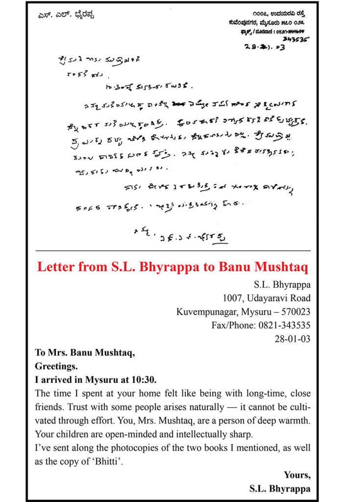 This year, Banu Mushtaq had the honour of inaugurating Mysuru Dasara. Reflecting on the times when late Dr. Bhyrappa had stayed at her home in Hassan, she took to social media yesterday to share a heartfelt and unexpected message with his admirers, offering a glimpse into a profound and enduring literary friendship.