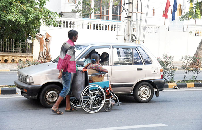 At busy junctions, including K.R. Circle, J.K. Grounds, Bamboo Bazaar, Field Marshal K.M. Cariappa Circle (Metropole Circle), Vinayakanagar (Paduvarahalli) Junction and SrimanMaharaja Sanskrit Patashala, beggars have reportedly been pushing elderly persons in wheelchairs into the middle of the road to solicit alms.
