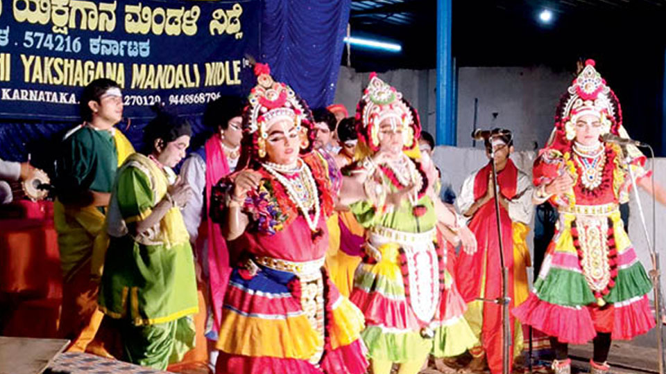 The performance was presented by the renowned Sri Mahaganapathi Yakshagana Mandali from Nidle, Dharmasthala, featuring popular artistes from Sri Dharmasthala and Kateel Hanumagiri in Dakshina Kannada. Organisers M. Ganesh and Anantavardhana were present on the occasion.