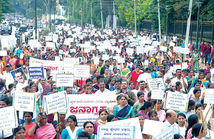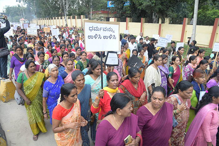 The protest was organised by Sri Kshetra Dharmasthala Abhimanigala Vedike, amid an ongoing Special Investigation Team (SIT) probe into allegations of mass burials of sexual abuse victims at Dharmasthala and surrounding areas over several years. The allegations were made by a former sanitary worker of the temple.