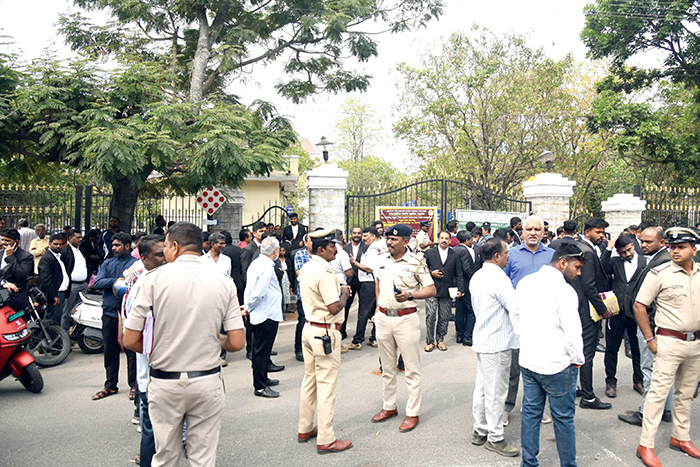 Mysore/Mysuru: A bomb threat e-mail to the Mysuru Court Complexes triggered panic and chaos this morning, forcing judges, advocates, Court staff and litigants to evacuate the premises in fear.