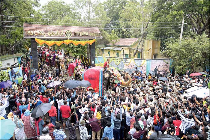 As the jumbo team passed via Ballal Circle, RTO Circle, JLB Road, Ramaswamy Circle, Chamaraja Double Road and Gun House Circle, the large crowds, including children, gathered along the route and cheered for their favourite elephant braving the heavy rains.