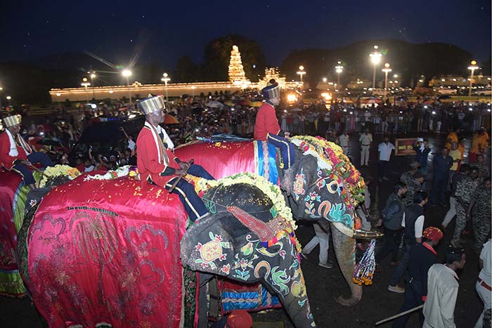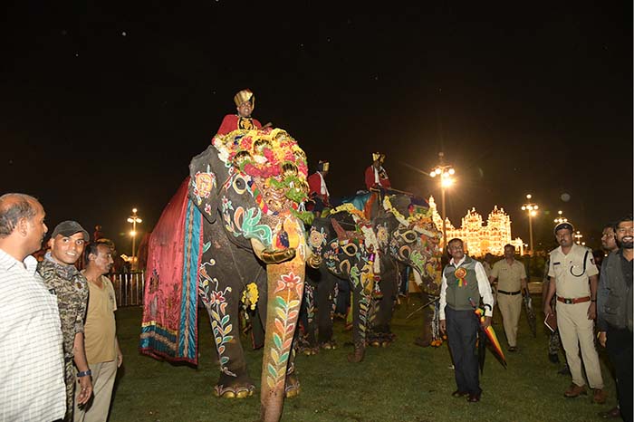District Minister Dr. H.C. Mahadevappa and other elected representatives also welcomed the elephants by showering flower petals on them.