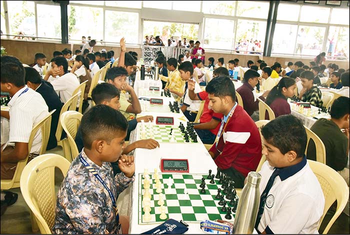 NR Group Chairman R. Guru (second from left) moving a pawn to inaugurate the day-long CCA PAZZO Inter-School Chess Competition organised by Carmel Catholic Association (CCA) Mysuru at St. Joseph Central School premises at Yelwal in city this morning. Others seen are (from left) JK Tyres and Industries Ltd. Vice-President (Works) V. Eswara Rao, Tournament Convenor P.D. Babu, MDES Secretary Fr. Edward William Saldana, CCA President Joseph Mathew and Mysore Chess Centre Director Nagendra Muralidhar.