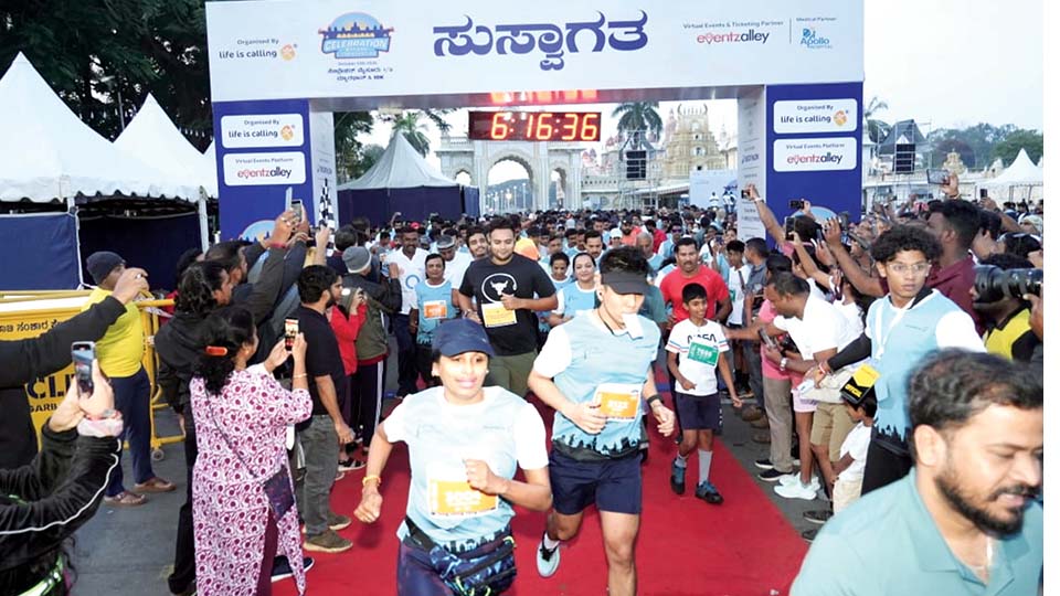 Mysuru: A total of 2,850 participants took part in the 15th edition of Celebration Mysuru Half Marathon and 10K Run organised by Life is Calling in city this morning. The half marathon was flagged off by Mysuru-Kodagu MP Yaduveer Krishnadatta Chamaraja Wadiyar and Apollo BGS Hospital Vice-President N.G. Bharateesh Reddy in front of Balarama Gate of Mysore Palace.