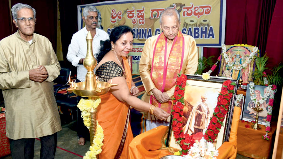 Vidushi Dr. Padmavathi Narasimhan offering floral tributes to a portrait of Chamaraja Wadiyar X during the inauguration of Chamaraja Wadiyar X Jayanti celebrations organised by Sri Krishna Ganasabha at Alwar Kala Bhavan in Gokulam 3rd Stage in city recently. Sabha President B.S. Sridhar Raje Urs and Sanskrit Scholar Vidwan Dr. H.V. Nagaraja Rao are also seen.