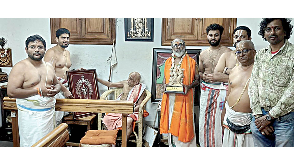 Mysore/Mysuru: Tharanallur Satheesan Namboodiripad, Chief Priest of Sri Padmanabhaswamy Temple in Thiruvananthapuram, visited Sri Brahmatantra Swatantra Parakala Swami Mutt in Mysuru yesterday and sought the blessings of the deity Sri Lakshmi Hayagreeva Swamy and Mutt Pontiff Sri Abhinava Vageesa Brahmatantra Swatantra Parakala Swami.