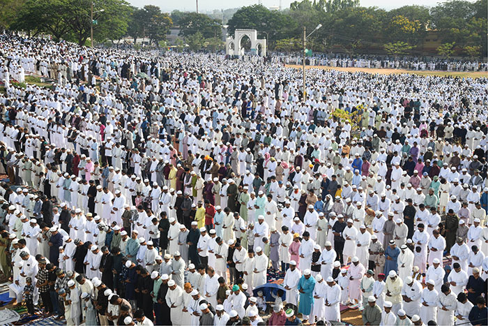 Sir Khazi of Mysuru Hazarath Moulana Mohammed Usman Shariff, who led the prayers at Eidgah Maidan in Tilaknagar said, “Celebrating Eid is not a mere formality, but is a message to the entire world to spread humanity, integrity and brotherhood.”