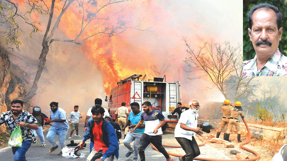 City photo-journalist M.S. Anurag Basavaraj, who participated in Altamira National Salon 2025 photography competition (Press photography category), has bagged gold medal for his photo of people fleeing from blazing fire at Chamundi Hill. The photo was clicked by Basavaraj about two months ago when a large forest area atop Chamundi Hill caught fire. People had crowded the spot when fire-fighters were dousing it during which gusty wind blew bringing the flames with it. Basavaraj clicked the photo when people were fleeing to escape the fire.