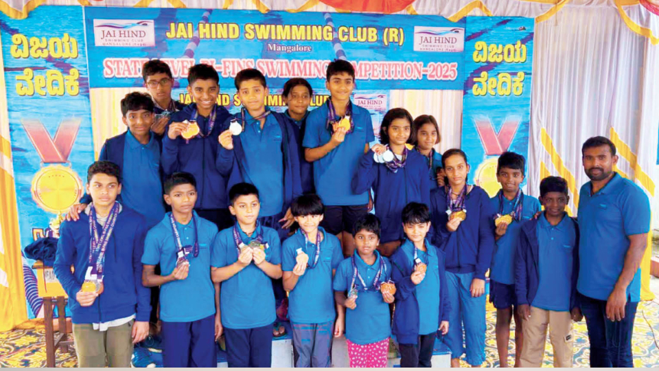 Mysuru, Oct. 9- The swimmers of Marlin Aquatic Centre in Vijayanagar 4th Stage, Mysuru, who took part in the State-level Bi-Fins Swimming Championship-2025 at City Corporation Swimming Pool in Mangaluru recently, have won 10 gold, 18 silver and 15 bronze medals in Group 1 – Group 5 kids category.