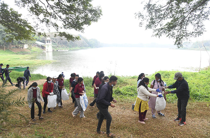The one-hour programme began at 7 am from Kuvempu Vana near the railway gate, where civic volunteers and students collected waste, including plastic and food litter, from across the lake premises.
