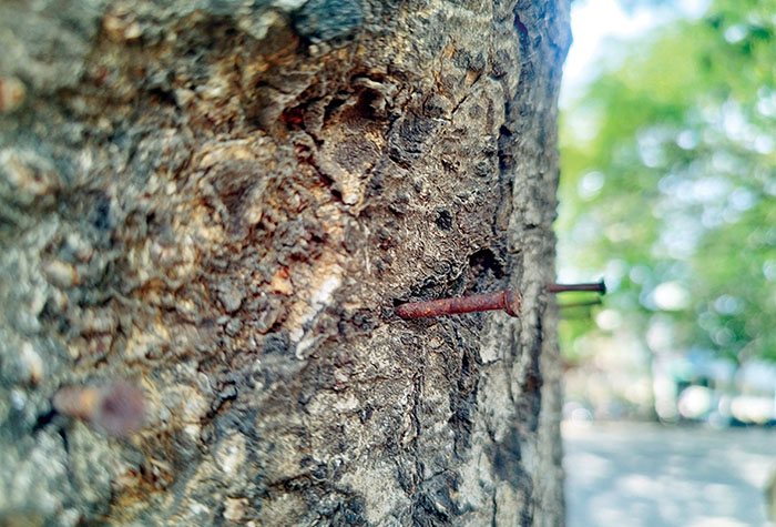 Residents are demanding that those responsible be identified and punished. Last year, the Forest Department warned that damaging trees, including carving them, fixing boards or hanging electrical lights, would attract penalties. Yet, violations continue unabated.