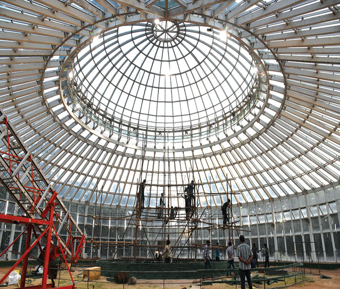 Picture shows workers erecting the structure inside the Glass House to create the floral replica of Gandhi Mandapam, the main attraction of this year’s Dasara Flower Show.