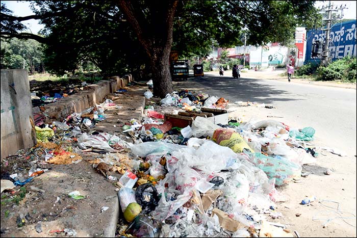 Picture shows Jodi Thenginamara Road in Bannimantap in same fate. The heaps of waste defeat the very purpose of the Mysuru City Corporation’s (MCC) ‘Swachh Dasara’ initiative.