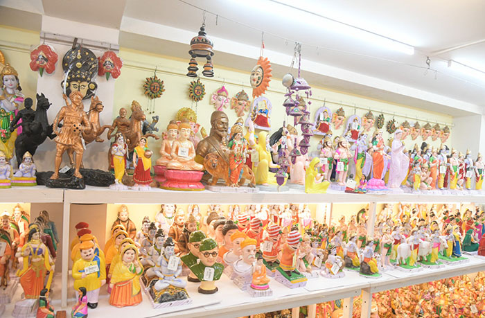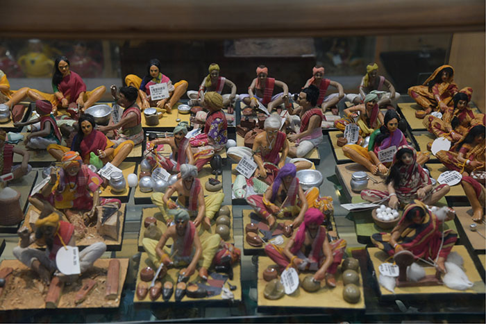 Thousands  of dolls embodying the significance of over 12 States like Karnataka: Mysore, Channapatna and Kinnal dolls.  Tamil Nadu: Tanjavur, Madurai, Kadalur, Pudukotai and Kanchipuram. Andhra Pradesh:  Kondapalli and Ettikoppa. Telangana: Nirmal. Puducherry. Rajasthan: Jaipur and Jodhpur. Gujarat. Uttar Pradesh: Aligarh, Varanasi and Saranath. West Bengal: Krishna Nagar, Bankoda and Kolkatta. Maharashtra: Kolhapur. Odisha and Kerala States.