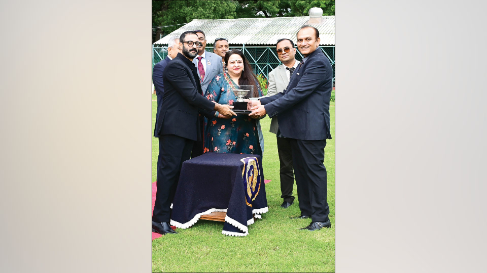 Vikram Muthanna, Chairman and Managing Director of Academy Newspapers Pvt. Ltd. (Publishers of Star of Mysore and Mysuru Mithra), is seen presenting ‘The Star of Mysore’ Trophy to Namrataa Rakesh, M.S. Kumaraswamy and Dr. Vijaya Simha Doreswamy, owners of ‘Pretty Move,’ which won the Mysore Monsoon Races held at MRC premises yesterday. The winning horse, trained by Rakesh, was ridden by Jockey S. Antony Raj.