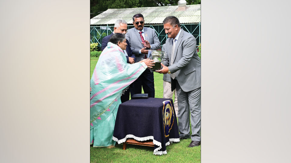 Pramoda Devi Wadiyar presenting ‘The Srikanta Datta Narasimharaja Wadiyar Memorial Multi-Million’ Trophy to K. Pradeep Annaiah, trainer of ‘Echoes of Time,’ which won the event in the 1st Day of Mysore Monsoon Races at MRC yesterday. The winning horse, owned by Sultan Singh (rep. Sohna Stud Farm), was ridden by Jockey S. Antony Raj.