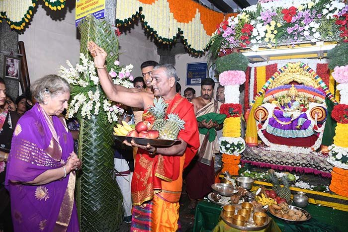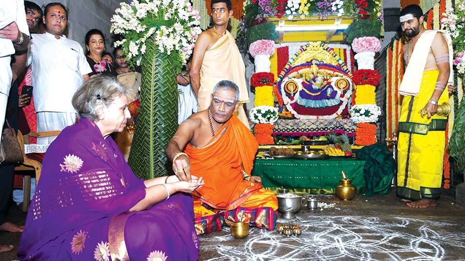 Pramoda Devi Wadiyar, Member of erstwhile Royal Family of Mysore, took part in the rituals associated with the Utsava, at Rudrakshi Mantap in the temple premises, where Utsava Murti of the presiding deity is consecrated.