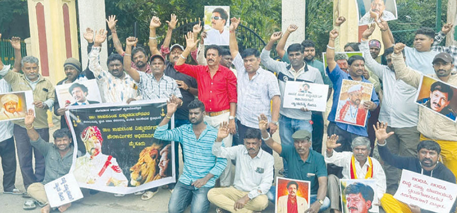 Mysore/Mysuru: Demanding the restoration of the cremation site of legendary Kannada actor late Dr. Vishnuvardhan, members of the Kannadambe Rakshana Vedike staged a protest yesterday in front of Dr. Vishnuvardhan Memorial, opposite Udbur Gate on Mysuru–H.D. Kote Road.
