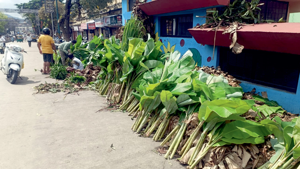 Vendors selling Sevanthige (chrysanthemum), other flowers — both loose and in garlands — and banana stalks, which are in high demand during Deepavali, lined Sayyaji Rao Road, Dhanvantri Road and nearby lanes.