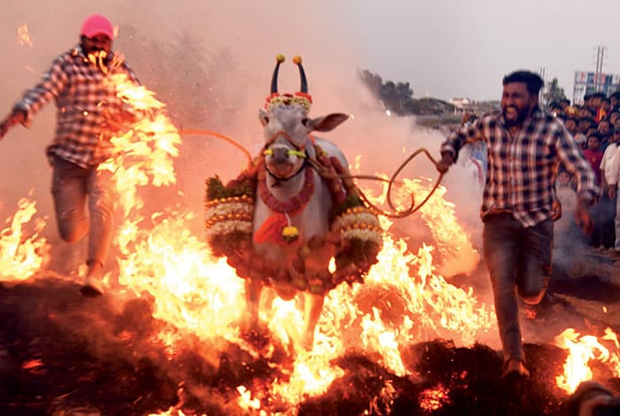 Main attraction of Sankranti: Ritual of cattle jumping over burning hay at Siddalingapura off Mysuru – B’luru Highway