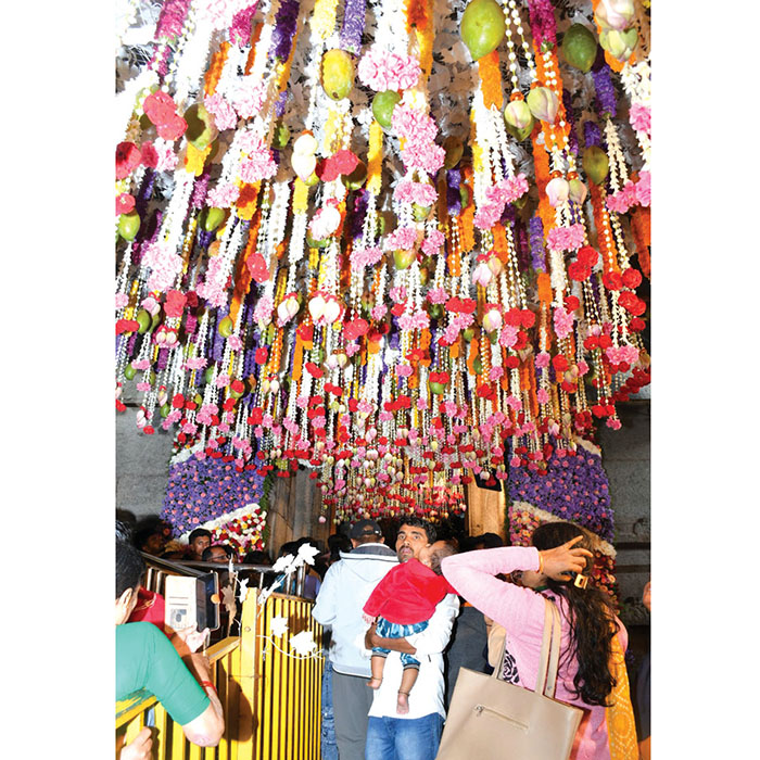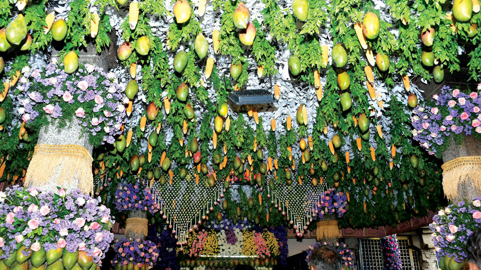 The Sanctum Sanctorum of Chamundeshwari Temple at Chamundi Hill were adorned with flowers of various hues and mangoes on account of second Ashada Friday Special Puja today.
