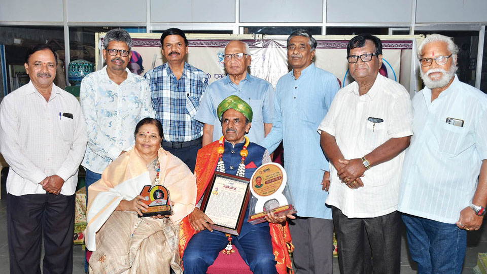 Folk scholar and theatre artiste U.S. Ramanna, who turned 75 recently, and his wife Dr. Y.C. Bhanumati, were felicitated at a programme organised by Kadamba Rangavedike, Mysuru, at Sri Kalanikethana School of Art in Vijayanagar, Mysuru. They are seen with folk scholar Dr. D.K. Rajendra, senior theatre person Prof. H.S. Umesh, senior journalist Amshi Prasannakumar, Rajashekar Kadamba of Kadamba Rangavedike, Sri Kalanikethana School of Art Principal K.C. Mahadevashetty, Nagendra Kumar and Ashwath Kadamba. On the occasion, a photo exhibition of the roles essayed by actor Ramanna in theatre was organised and Ramanna’s disciples Kartik Upamanyu and Vishal presented Kamsale.