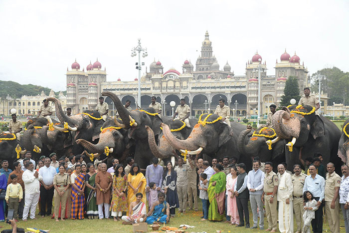 After the puja, Deputy Commissioner G. Lakshmikanth Reddy showered flower petals on the elephants, followed by City Police Commissioner Seema Latkar, Additional Deputy Commissioner Dr. P. Shivaraju, Conservator of Forests (CF) Dr. Ravindra, DCF I.B. Prabhugowda, DCPs R.N. Bindu Mani and K.S. Sundar Raj, Deputy Director of Mysore Palace Board T.S. Subramanya, Palace ACP Chandrashekar and others.