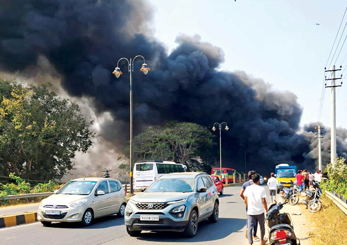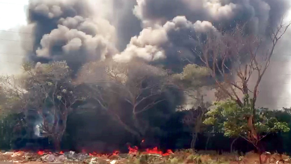 Mysuru: Thick smoke emanating from the garbage heap, which was set on fire at Dasara Exhibition premises, created tension on Mysuru-Nanjangud Road, with motorists especially two-wheeler riders finding it difficult to navigate on the smoke-filled Road yesterday.
