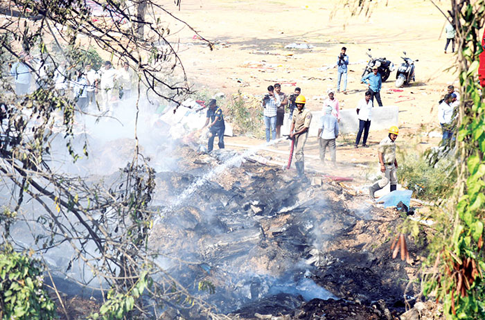At about 3 pm, fire was set to the garbage heap resulting thick black smoke emanating from it. As the fire increased, thick black smoke engulfed M.G. Road and Mysuru-Nanjangud Road forcing motorists to stop their vehicles on the roadside due to poor visibility.