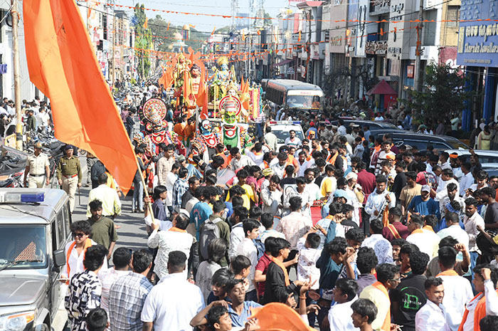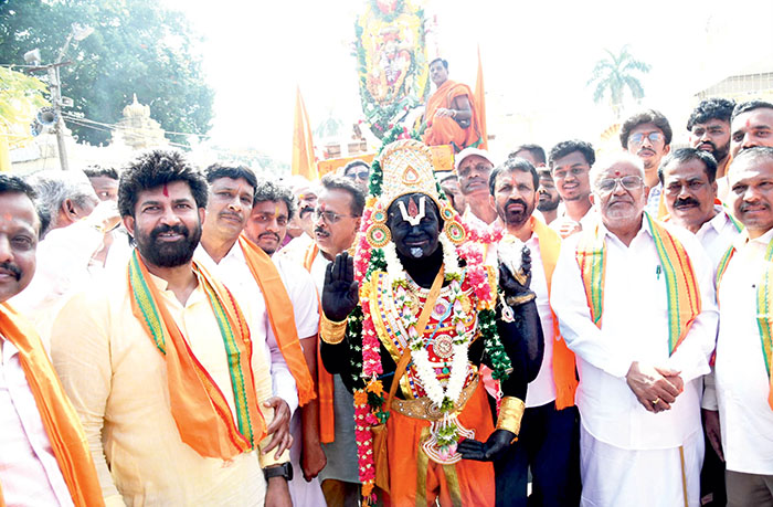 The procession, featuring idols of Lord Rama, Lord Hanuman and Lord Shiva, began from Kote Anjaneyaswamy Temple.