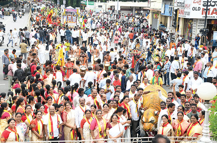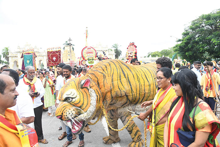 The procession passed through Chamaraja Wadiyar Circle, Albert Victor Road, K.R.Circle, D. Devaraj Urs Road, JLB Road, Field Marshal K.M. Cariappa Circle and Vinoba Road, before culminating at Kalamandira, where the stage programme was held.
