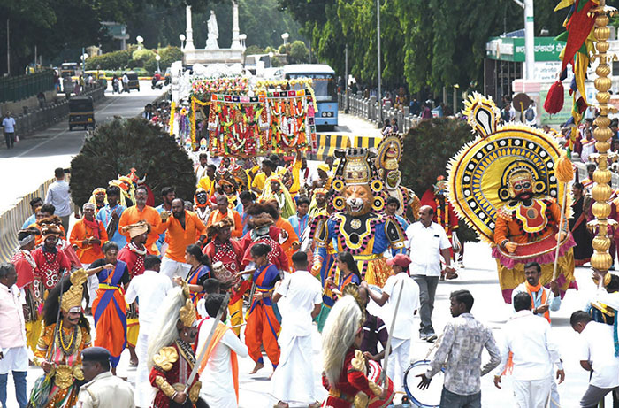 A colourful procession featuring vibrant folk and cultural troupes, giant Yakshagana figures and Mahishi characters being taken out on the occasion.