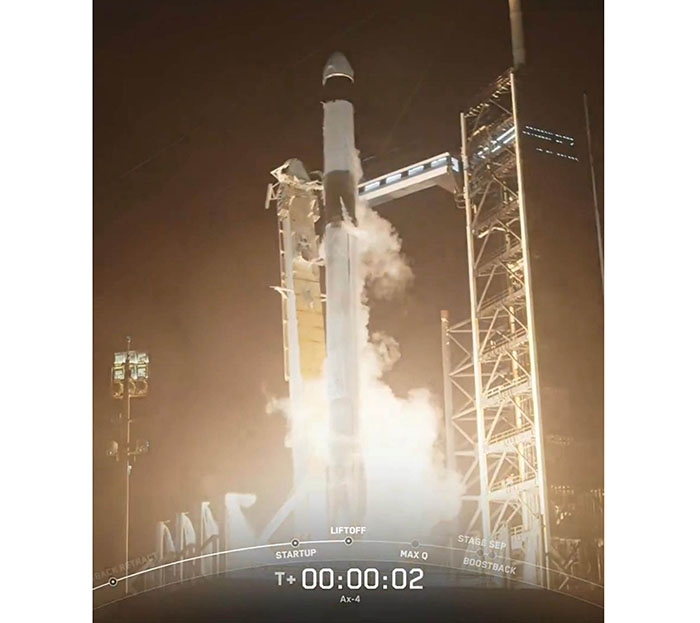 Florida: Carrying the hopes and dreams of billions, the Axiom-4 (AX-4) Mission, piloted by Indian astronaut Group Captain Shubhanshu Shukla, along with three other crew members — veteran astronaut Peggy Whitson (USA), Polish engineer Sławosz Uznański and Hungarian researcher Tibor Kapu — to the International Space Station (ISS) for a 14-day experiment, took off from Kennedy Space Centre, Florida at 12.01 pm (IST) onboard the Space Dragon Aircraft, today.