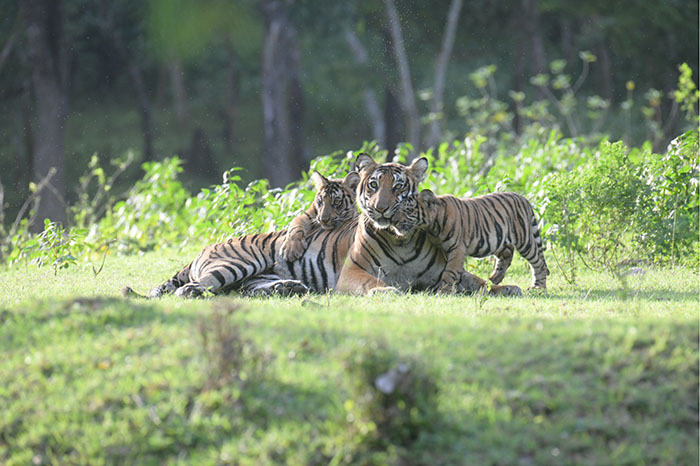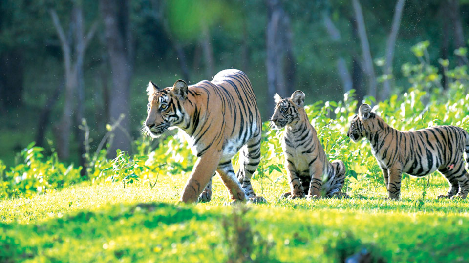 Visitors to Kakanakote Safari Centre at Dammanakatte in H.D. Kote taluk under the Nagarahole Tiger Reserve were in for a treat as they witnessed a tigress along with its two playful cubs. July 29 being ‘International Tiger Day,’ many wildlife enthusiasts and shutterbugs from Mysuru visited the safari centre to capture the tigers on their mobile phones and cameras. International Tiger Day was celebrated at all 57 tiger reserves in the country including Nagarahole Tiger Reserve to create awareness on tiger conversation. The tigress at Nagarahole Tiger Reserve is famous among the wildlife enthusiasts as ‘Magge Female’ and is considered to be one of the iconic tigers in Kabini. [Pic. by M.N. Lakshminarayana Yadav]
