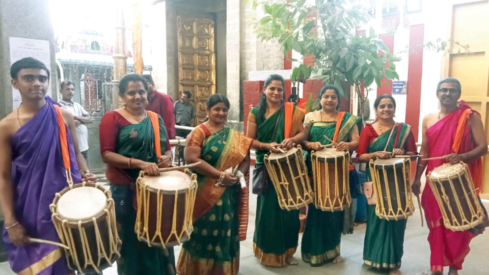 The group performed for the first time at Arivu Habba in January 2023, with both men and women in the team. Encouraged by P.V. Adarsh Rao, they soon began performing at several events. “Five of us women, along with two or three boys, performed at various venues, including Chikka Gadiyara during Dasara. We also played at temple festivals such as the Krishna Utsava at Mysore Palace. The first-ever Chende performance atop Chamundi Hill was by our troupe in September 2023,” she says.
