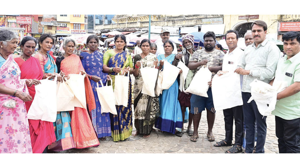 Mysore/Mysuru: On account of International Plastic Bag Free Day on July 3, the members of Akhil Bharatiya Grahak Panchayat, Mysuru Unit and KMPK Charitable Trust, created awareness by distributing cloth bags for free in front of Devaraja Market in the city.